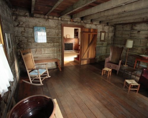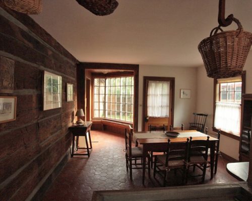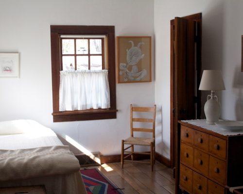 The Barrett-Gate House is located at the corner of Main and North Streets in historic New Harmony, Indiana. It’s adjacent to The Red Geranium Restaurant entrance, across from the Roofless Church. It consists of two relocated and conjoined structures. The log portion of the guest house is part of an original Harmonist log cabin built in the early 1800s. The framed section was added when the house was moved to its current location. The Barrett-Gate House has lodged many artists through the Robert Lee Blaffer Foundation’s creative partnerships. Guests are encouraged to enjoy and respect the unique nature of this historic structure and its surroundings.