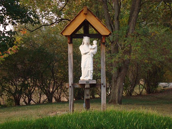 Located northeast of the Roofless Church at the end of Main Street, this stone carving of Our Lady and the Christ Child is from Isle St. Louis, France, and is the work of an unknown 15th-century sculptor. This is New Harmony’s oldest work of art. It was dedicated to the memory of the Trappist Monk, Thomas Merton (1915-1968), in 1986 by a Trustee of the Merton Legacy Trust. The shrine is open 24/7 for personal contemplation.